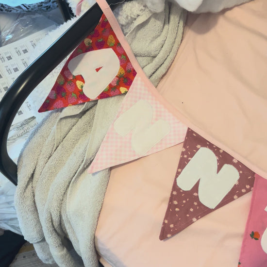 A classic triangular flag style, strung together with ribbon and ready to hang.