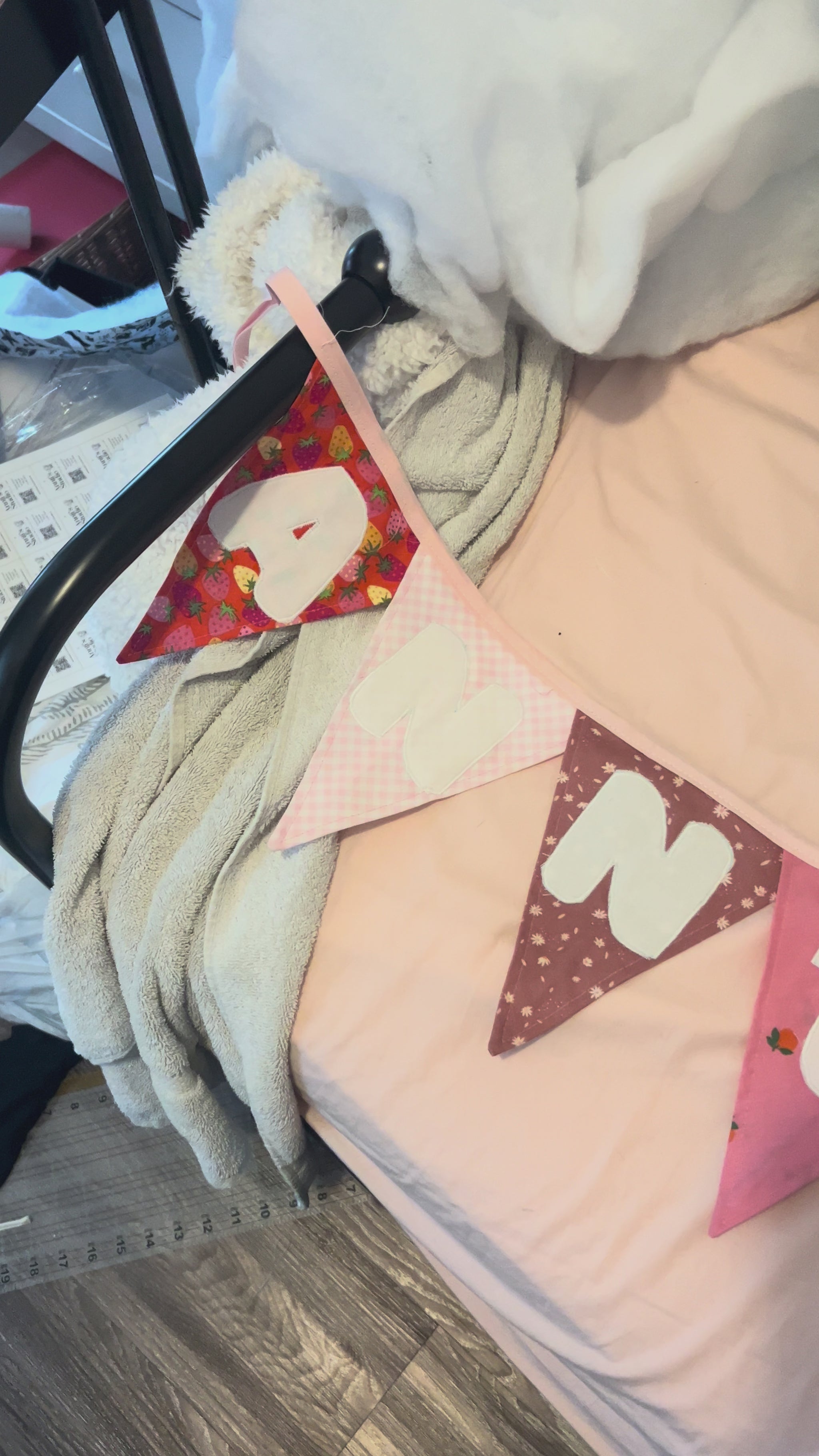 Each flag features an appliqué letter.